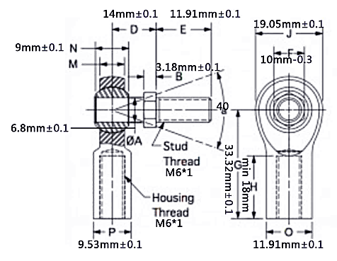 Spherical Rod End, Female, M6 x 1.0 RH, Steel Housing, PTFE Race With Integral Ball Stud